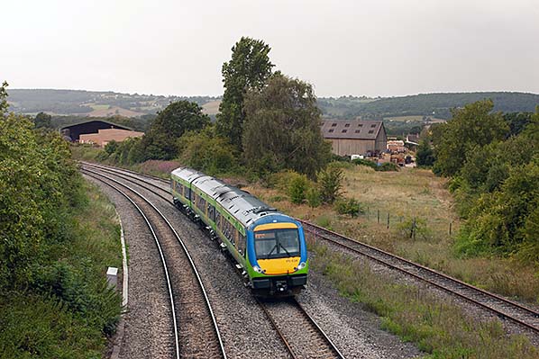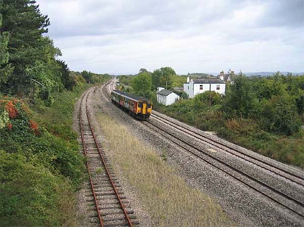 Photo by David Stowell. Reproduced from Geograph under creative commons licence ![]() On 31 July 2006 Central Trains Class 170 No. 170 634 approaches the site of Grange Court Junction station with 1M66, the 12:45 Cardiff to Nottingham service. Use of a zoom lens makes the background buildings appear closer than they actually are. The former line to Ross-on-Wye and Hereford swung away not at the gap in the trees as one might assume but at what is now a group of trees and above the second carriage of the DMU. After leaving Grange Court the Hereford line followed a very gentle curve for some distance and was all-but straight until Church Lane, after which it gradually turned northwards towards Longhope. The South Wales line, as seen here, followed a much more pronounced curve as it headed towards Newnham. The farm building seen through the gap, right of centre, stands just north of the former Church Lane level crossing at 31 chains from Grange Court. The buildings in the left background are of, at the time of writing, Severn Valley Woodworks and on the site of what was in the dim and distant past the Albion Carriage & Wagon Works. As can be seen, in 2006 the Up loop was still in situ. The National Express owned Central Trains franchise was to disappear, thankfully some many say, in 2007 after a little over ten years existence. Photo