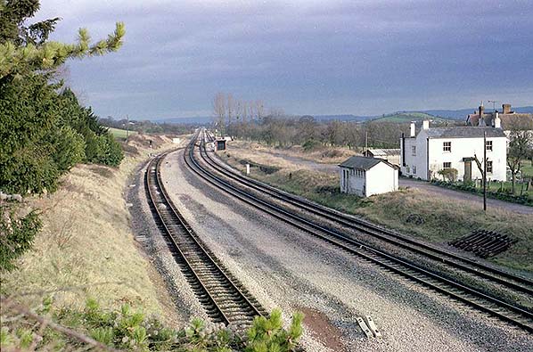 ![]() The third of the three photographs showing the train of withdrawn locomotives, this time having passed through the closed Grange Court station. In order behind No. 7816 hauling the train are nos. 44123, 44422, 7034 and 7022. As was the usual practice the two Castles have had their name and number plates removed but all four of the withdrawn locomotives have their coupling rods in situ; often these were removed to prevent bearings running hot and seizing but it would depend upon how long the journey to the scrapyard was. Commonly these journeys would not be undertaken in a single move and in this case the train would have been placed onto a siding somewhere, possibly at Newport, as the four withdrawn locomotives were destined for two different destinations. Bringing up the rear of the train is an example of the very familiar GWR 'Toad' brake van. Photo by Graham Turner ![]() This was the scene viewed from the road bridge facing towards Gloucester in January 1981. Right of centre stands the only surviving fragment of the former station and to its right the former stationmaster's house. Also visible is the overgrown remains of the former goods dock. Grange Court stands in the right background. At this time both Up and Down loops and crossovers were still in situ, the Down loop being visible in the distance. The Up loop, left, was quite lengthy and occupied what had been the Up side siding west of the station and part of the Up Hereford line formation albeit on a slightly different alignment. The purpose of the loops was as with most such, to get relatively slow moving goods trains out of the way of passenger trains. While goods traffic still passes through Grange Court, or at least paths exist, the days of the plodding goods train have long gone. In about 2010 the track at Grange Court was simplified with the Up loop being removed and the Down initially disconnected before being removed entirely and the signalling modified accordingly. Today just plain double track runs through the site.