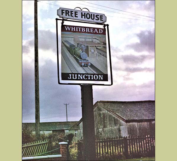 A close-up of the then inn sign in January 1981. It incorporates a decent representation of part of the station and a reasonable representation of a GWR passenger train. The signs of most inns with a railway connection have reasonable and historically accurate depictions, but unfortunately a small number do not. The sign seen here has since been replaced.