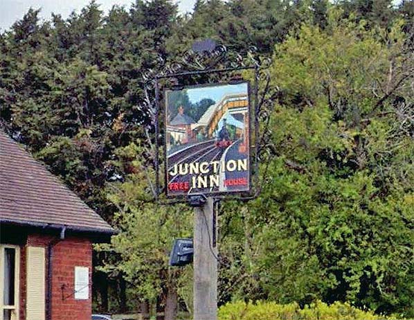 by Jules Hathaway from his SmugMug web site ![]() The Junction inn as caught by the camera on 3 November 2011. The new inn sign is in position and a running-in board adorns the front wall of the building. This board looks like that which once stood on the Up Hereford line platform, being shallower than other boards on the station. However, at the time of writing it was not known if this board is a restored original or a replica and contradictory claims have been seen on the internet. Inside the building are, it is said, railway photographs and various artefacts.