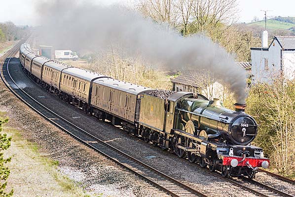 ![]() Shortly before midday on 25 March 2017 Castle class No. 5043 Earl of Mount Edgcumbe passes the remaining fragment of Grange Court Junction station and the site of the now-lifted Up loop with Vintage Trains The Welsh Marches excursion to Hereford. The train started and ended at Tyseley (Birmingham, where the locomotive is based) with the outward leg being via Kidderminster, Cheltenham Spa and Gloucester. To reach Hereford it was necessary to travel via Abergavenny, the more direct route via Ross-on-Wye having of course long since ceased to be an option. The return from Hereford was via Cravens Arms, Shrewsbury and Wolverhampton. Within the train formation are three of the Pullman cars built be Metro-Cammell 1960 - 1961 and based upon the BR Mark I design. They are the fourth, fifth and sixth vehicles. No. 5043 was new to traffic in March 1936 and named Barbury Castle until renamed the following year, the Earl of Mount Edgcumbe name being previously on a Duke class locomotive dating from the Dean era. The name Barbury Castle was later given to another Castle class member, No. 5095. The human rendition of the Earl of Mount Edgcumbe was a Director of the Great Western Railway and the original naming, of the Duke class locomotive, was probably the 5th Earl, Piers Alexander Hamilton Edgcumbe although this has proved difficult to confirm. Not too obvious in the photograph is that No. 5043 carries a double chimney. She was withdrawn in December 1963 and sent to the famous Barry scrapyard were she lingered for about a decade before being rescued for preservation. As such she is one of eight class members to have survived.