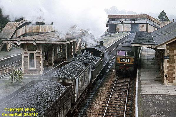 Copyright photo from Colour-Rail ![]() On 30 October 1964 a coal train from South Wales was captured by the camera at Grange Court. The locomotive was recorded as being 2-8-0 No. 3812, this being a member of the 2884 class which was a Collett development of the Churchward 2800 class. The majority of the 2884 class were built during the Second World War and No. 3812 was one such. She lasted until June 1965. The exhaust tell us the locomotive is under power and therefore the train is moving but the fireman watching the camera and the man on the platform convey the impression the train had for some reason paused in the station. On the Down South Wales line is a Brush Type 4 (later Class 47) diesel locomotive. The '7V' of the four-character headcode tells us the train is an unfitted (unbraked) goods working onto and terminating in the Western Region from another region, for example the London Midland Region. In all likelihood the train was coal empties bound for South Wales. Four character headcodes are still used today although they have long since ceased to be displayed on locomotives and certain types of multiple unit. At far right an enamel 'YOU MAY TELEPHONE FROM HERE' sign is affixed to the wall. In an age when few people had a telephone at home and long before the internet and mobile devices this facility was very common at staffed railway stations and other places. These signs have become collectors' items but a small number remain in situ, forgotten in plain sight.