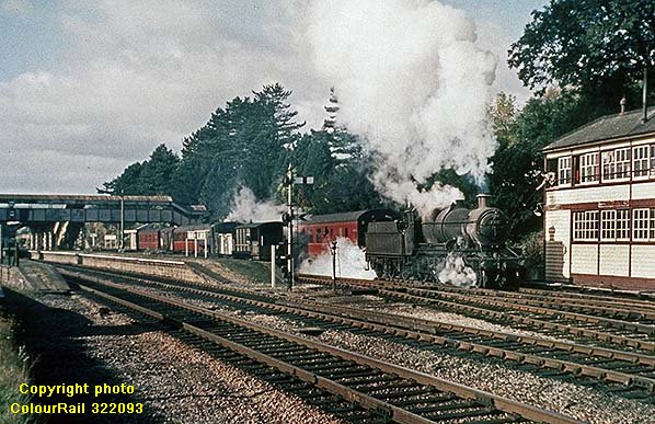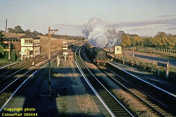 ![]() Copyrigh photo from Colour-Rail ![]() On the final day of passenger services over the Hereford line and of course of Grange Court station, Saturday 31 October 1964, a train has just departed the station on its way to Hereford. Enthusiasts can be seen in the rare carriage, a Hawksworth Brake Second, and this may have been the same train as seen in another photograph but travelling in the opposite direction. If so the implication is of a group of enthusiasts indulging in a round trip on the line. However the other photograph is undated and a different locomotive was in charge although it may well have been changed at Gloucester. The train seen here is being signalled by the signal to the left of the stabled wagons. This seemingly odd position for the signal would have been for sighting purposes from the station, GWR locomotives being righthand drive and therefore drivers would be able to see this signal when at the station. The wagons are fouling the points leading to the private siding and under magnification the private siding appears to be out of use. Grange Court goods yard had closed in 1963 and this scene strongly suggests the private siding had fallen out of use by October 1964. This should not be taken as fact however, as use of the private siding may have been infrequent and the wagons only stabled fouling the points temporarily. Note the man taking a photograph while standing between the Up South Wales line and the Up loop. He may have been a railway employee but in those days enthusiasts not in railway employment could get away with this and nobody really bothered. Nevertheless and whoever the man was, he would have been looking out and station staff probably knew of his presence, advising him of when a train was due. It was possible at one time to obtain a Track Permit and enthusiasts armed with cameras sometimes did but it depended very much upon who you were and who you knew within the railway