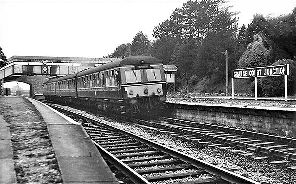 at a senior level. Photo by Francis Proctor ![]() On 31 October 1964, the final day of trains calling at Grange Court, an eastbound Swindon 'Cross Country' DMU (later Class 120) rasps away from Grange Court with what is presumably the secondman making sure he gets into the photograph. The train is bound for Cheltenham Spa (St. James) and will have started at Cardiff General, as what is now Cardiff Central was once named. There were half a dozen or so of these local trains per weekday, the majority of which ran to St. James. Cheltenham once had several stations, a legacy of originally being served by different railway companies. St. James was a GWR terminus and closed to passengers on 3 January 1966. Note the Down South Wales line, foreground, has been re-laid with flat bottom rail and fresh ballast. Beyond the bridge lurks a locomotive and under magnification it appears to be a Pannier Tank. The wagons also visible through the bridge arch are on the siding which ran alongside the Hereford line.