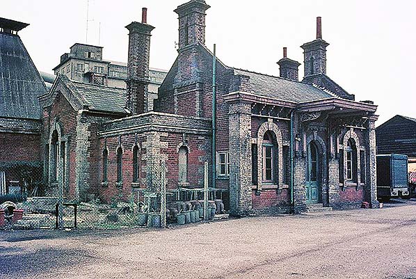 ![]() Station Name: HADLEIGH![]() Hadleigh station forecourt in 1980. The station is being used as a store by Hadleigh Council. One of two timber goods sheds is seen to the right.