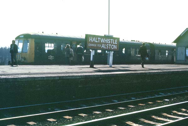An Alston DMU stands in the branch platform at Haltwhistle station in spring 1976, a few weeks before closure of the branch.