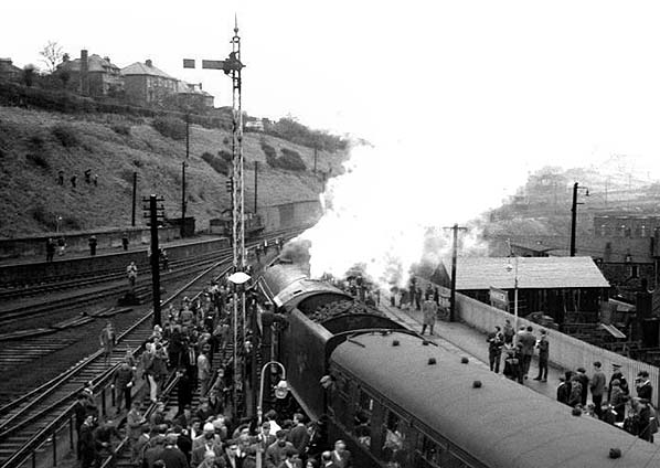 ![]() A4 Pacific No. 60019 'Bittern' stands at the north end of Hawick station with the Waverley RCTS railtour on 12 April 1966 (seen from the signal box). Note the Clayton station pilot in the background which is stabled at the end of the goods dock.