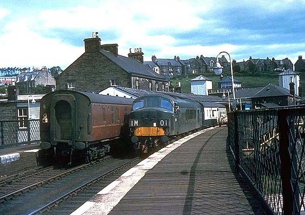 ![]() Hawick station looking north as Waverley line services cross in June 1968. The southbound train into which mail is being loaded is the 1445 Edinburgh - Carlisle headed by D14, one of the early Peaks, still with its gangway doors.