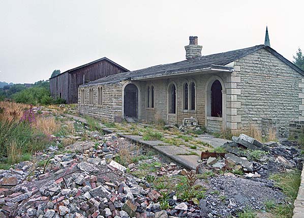 Helmshore's main station building and booking office in April 1976. The large goods shed is seen in the background.