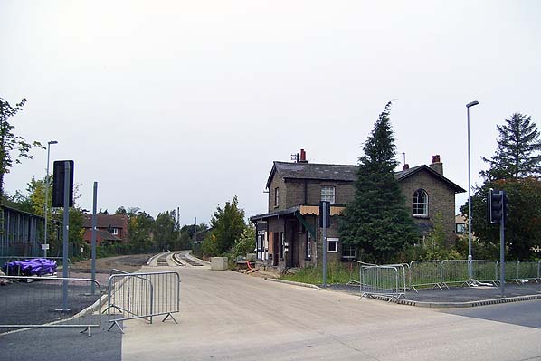 Looking north-west across the level crossing towards Histon station in October 2008, during the construction of the guided busway.