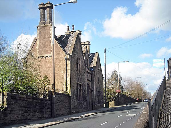 Looking north in April 2014 along Station Road, Holmfirth, at the Tudor Gothic station building, now in residential use and Grade II-listed.