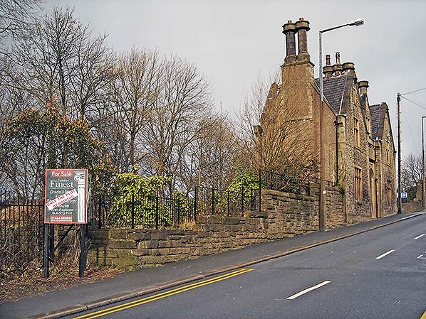![]() The station building at Holmfirth, looking north across Station Road on 2 February 2016. The estate agent’s board notes that the ‘Former Station Master House’ has just been sold, but also shows that the trackbed is for sale for building use. The station house is a noble Tudor Gothic structure, built in 1850 when the station opened. It has retained much of its original character and been Grade II listed. The lofty chimneystacks are especially impressive. Photo by Alan Young