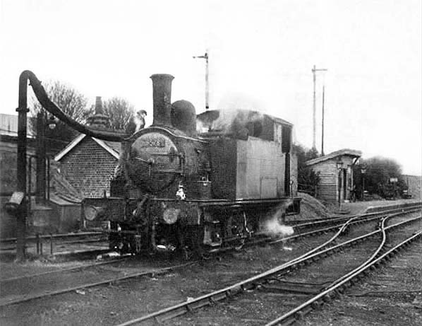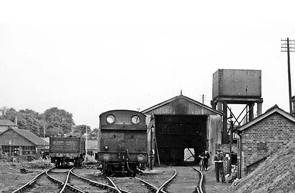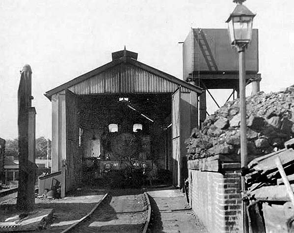 In 1937 Class J68 No. 7045 was caught in repose inside the engine shed. This view offers a good idea of the construction of the engine shed. On the right the coaling stage, if it could be called a 'stage', was then fairly new and predated the wood store, bottom right. The wood was used when lighting up locomotives. Kelvedon shed, a sub shed of Colchester, had two locomotive crews working an early and late turn, Colchester shed providing relief men as necessary. Locomotives were coaled and watered overnight by the coalman. The early turn crew would have booked on several hours before they were due to take the first train of the day out, because of the time required to prepare steam locomotives. The gas lamp on the right was of the suspended mantle type and believed to have been the only gas light at the Low Level station. Its supply was likely piped from the main line station, a fairly simple job.