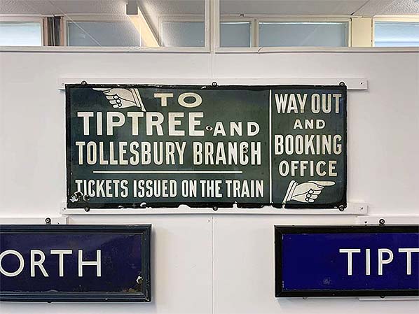 The sign seen in the previous photograph now safe in the museum at Chappel & Wakes Colne station. How many of these existed is not known but close examination of damage to the enamel tells us this is the same sign in both photographs. At the bottom, partly in view are the running-in boards from Inworth and Tiptree.