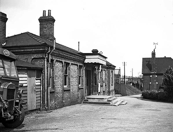 The forecourt of Kelvedon main line station on an unknown date in LNER days. The Thornycroft lorry, far left, carries the LNER 'Hawkeye' logo which was introduced in 1932, therefore giving an earliest possible date. The stationmaster's house stands on the right, the Kelvedon stationmaster being responsible for the entire Kelvedon & Tollesbury Light Railway. Through the gap and in the background can be seen the footbridge to the Low Level station and the water tower. The engine shed was to the right of the water tower but is here hidden from view by the house. The rather makeshift-looking steps to the station entrance look as though they were provided as an afterthought, perhaps replacing a conventional doorstep. The upper level is well worn and one wonders how many people tripped or slipped on these steps. This station building was demolished in the 1980s and replaced by a new structure which although perfectly fit for purpose resembles the entrance to a supermarket. The lattice footbridge, partly visible to the right of the station building was once roofed. It has long since been replaced.