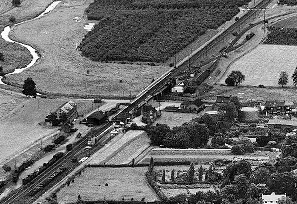 An interesting aerial view from 1946, looking north. Clearly visible is the main line station with its extended Down platform, as are both main line goods yards and the walkway to the Low Level station. The stationmaster's house is the building to the right of the station footbridge. The Low Level station would not be easy to see were it not for the presence of the waiting shelter and engine shed. The light railway can be seen curving away towards Feering Halt and on the carriage siding is what appear to be four tank locomotives. These may have been used during the war on the Tollesbury Pier extension and might have been moved to Kelvedon pending onward movement. However, and as interesting as this suggestion may be, the photograph is too unclear to be certain. Right of centre is Kelvedon gasworks and the gaggle of buildings to its right are the omnibus garage of F. C. Moore Ltd. Meandering its way in from top left is the River Blackwater. It rises near Sewards End, Saffron Walden at which point it is known as the River Pant until Bocking, near Braintree, where it becomes the Blackwater.