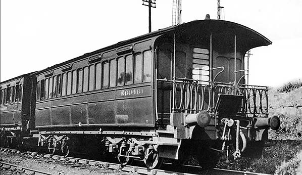 In early British Railways days ex-Wisbech & Upwell car E60461 sits at Kelvedon in the company of ex-Stoke Ferry Brake Third E64462. The numbers are still the LNER style but with the 'E' added. A fair view is offered of the drop plate which was used by conductor guards to move through the train to issue tickets. The plate is seen here in its retracted position. Also visible are the hinged gate and grab handles provided for guards. Passengers, if any, were not permitted to ride on the verandahs of these cars. The Great Eastern main line is in the background.