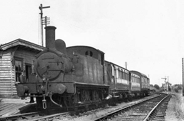 On Saturday 29 July 1950 Class J67 No. 68616 has arrived at Kelvedon with the 12.50pm ex Tollesbury. The train formation is quite typical of a mixed working by this time; an ex-Stoke Ferry brake third, an ex-Wisbech bogie car, the Gresley van and the goods brake van. Obviously there were no goods vehicles to be returned to Kelvedon on this occasion.