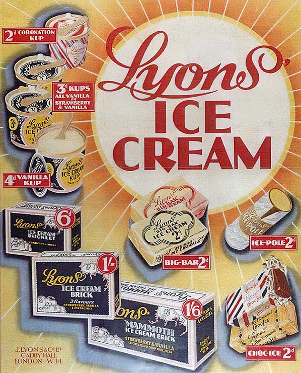 This poster dated from 1953, hence the 'Coronation Kup' marking the Coronation of Queen Elizabeth II. There were different designs of the 'Kup' with the most famous having scenes of the Gold State Coach and soldiers of the Household Division. The cups and bricks were packed in waxed card but the bricks could be difficult to extract without tearing the box apart. The other products shown were packed in waxed paper or in the case of the Pole a waxed card tube. The price of the 'Mammoth Brick' equates to 7.5p in decimal currency.