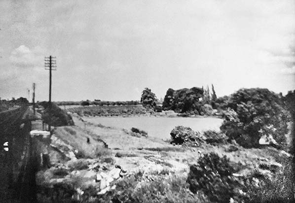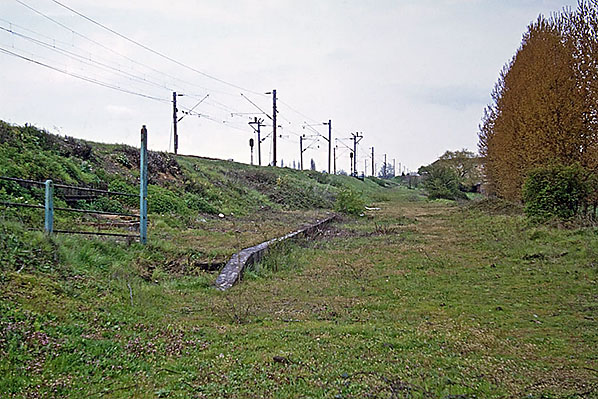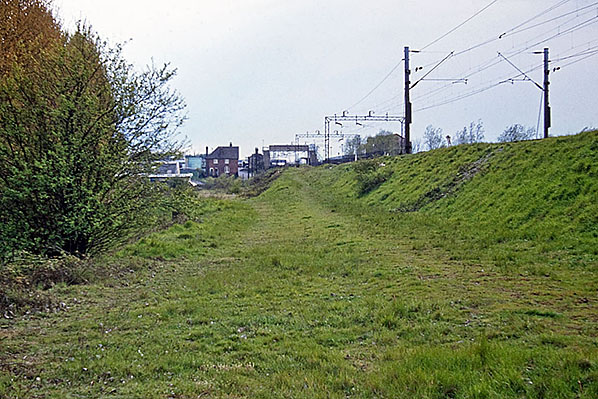 Photo from Leiston Works Railway ![]() The remains of Kelvedon Low Level on 30 April 1977 and looking south towards the main line station. The Low Level station was in the distance and in the centre of the photograph, nearer the camera, is the remains of the incline from the main line. Quoted as being on a 1:50 gradient it always appeared rather steeper. Where the trackbed widens at left foreground was where the carriage siding branched off, the signal box having once stood left of centre. The oddly shaped house in the background was Kelvedon stationmaster's house. It is still there in 2024. Between the house and the footbridge but further back is the original main line station building, now longer in existence.