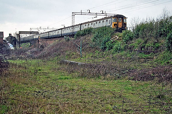 Photo by Mark Dufton ![]() The remains of the Low Level station platform on 28 March 1978. Compared to the state of things a year earlier, nature really was taking over the site. The train on the main line is formed of two 4-car Class 309 electric-multiple units. Commonly referred to as 'Clacton Units' they began life in 1962 as Class AM9 and were built for Liverpool Street - Clacton/Walton services. They spent most of their lives on these services but in 1994 a few were transferred to the Manchester area and could on occasion be seen at Euston. The last were withdrawn from passenger service in 2000. The unit seen here still has its wrap-round cab windows and eventually these would be replaced by flat windscreens with small, separate side windows. The result was not aesthetically very pleasing. The four-character headcode system is still in use today but has long since ceased to be displayed on trains. The first numeral, '1', signified express passenger and '2' stopping services. 'F' was the code for Liverpool Street - Colchester - Clacton/Walton passenger trains. The last two numerals identified specific services in terms of the timetable with odd numbers for Up trains and even numbers for Down trains. The same system was used on the Liverpool Street - Cambridge - King's Lynn line except that the letter 'L' was used. On BR Eastern Region the system was peculiar to the former Great Eastern lines.