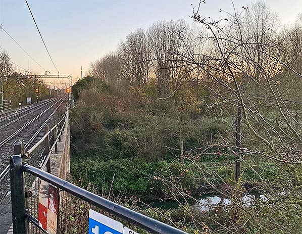 Photo by Rosalind Lifford ![]() A January 2023 view from the country end of Kelvedon Up platform towards the site of the Low Level station. Many decades earlier the photographer would have been looking along to walkway to Low Level. The walkway was supported by iron stanchions adjacent to the piers of the brick arch main line bridge, from which latter there may have been some cantilevered supports at the south end. The River Blackwater runs across the bottom of the photograph and on the opposite bank, directly ahead of the photographer, stood the Low Level engine shed. The Low Level station itself was situated beyond the engine shed but before the steeply graded connection with the main line. The connection branched off about where the nearest catenary gantry stands, left of centre. At around the time of this photograph the degraded remains of the Low Level platform reputedly still existed but the site is private property and now very difficult to physically access.