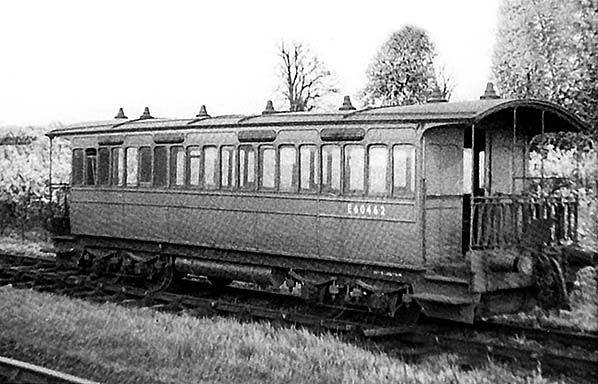 Photo by PM Alexander ![]() A somewhat forlorn looking E60462 sits on a siding somewhere at Kelvedon (logically it is the carriage siding although the running line, bottom left, appears too close) with one wheel set chocked. This view is thought to date from after withdrawal of the passenger service on 7 May 1951 and E60462 was not officially withdrawn from service until December 1951 while sister car E60461 was officially withdrawn in October 1951. The last of the ex Wisbech & Upwell 4-wheelers was withdrawn in March 1948. It had been Wisbech car 3 and at the time of withdrawal was British Railways E60465; this was its official number but whether the 'E' prefix was actually applied is unclear. Returning to the photograph it can be seen that the droplight furthest from the camera is propped up with a stick. Most likely the leather strap had broken, this being a not uncommon occurrence as vehicles aged.