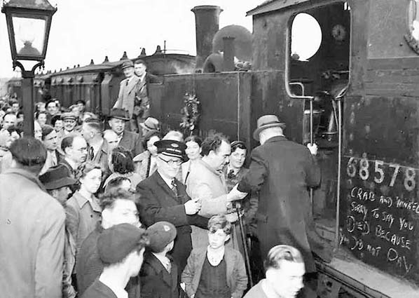 Last Day (5 May 1951) - July 2024 ![]() No. 68578 has arrived back at Kelvedon after working the final passenger train. Reputedly this train ran to time throughout. Note the wreath and the typically juvenile, for such occasions, chalkings on the side of the bunker. Similar chalkings adorned the other side and front of the locomotive. Somebody did not know how to spell 'Winkle'! The Kelvedon stationmaster is here seen present, still wearing his LNER cap. The gentleman seen being helped from the footplate and most unsuitably dressed for such a location was perhaps the Maldon MP Tom Driberg who had tried to save the line although no doubt primarily in the hope of gaining votes as by 1951 hardly anybody used the line and this would not have changed had the service been saved.
