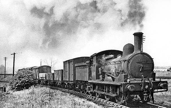 Photo from John Mann collection ![]() A familiar friend, Class J15 No. 65443, is seen here departing Kelvedon with the goods train for Tiptree and Tudwick Road Siding. She still carries the full 'BRITISH RAILWAYS' title on her tender. The main line can be seen in the background. The date is 19 May 1951, two weeks after withdrawal of the passenger service and closure to all traffic of the line beyond Tudwick Road Siding.