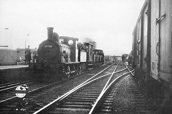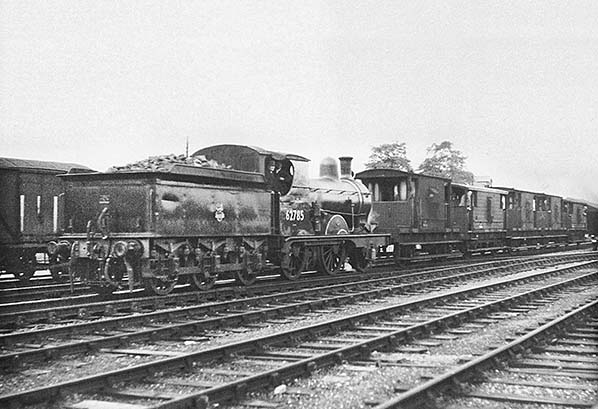 Photo from Jim Lake collection ![]() Class E4 2-4-0 No. 62785 has arrived back at Kelvedon following the brake van tour of 27 September 1958. Whether this tour terminated at Tiptree or continued to Tudwick Road remains a mystery. The location is Kelvedon Down side goods yard. At this time No. 62785 was fitted with a tender cab to protect the crew when running tender first. A number of Class J15 locomotives were also so-fitted, the primary reason being for operation on the Colne Valley Line (Haverhill - Chappel & Wakes Colne). These duties were taken over by Ivatt Class 2 2-6-0 locomotives which had tender cabs from new, then by diesel-multiple units and railbuses. No. 62785 now resides at the National Railway Museum restored to Great Eastern Railway livery, minus tender cab and dented tender. She was the final 2-4-0 tender locomotive to operate on what we now call the National Network.