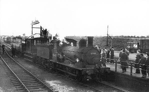 Photo by NC Simmons ![]() Class J15 No. 65443 is seen here with the open wagon railtour of 6 April 1957. The diminutive 'REC' (Railway Enthusiasts Club) headboard has yet to be attached. The location is Kelvedon Up side goods yard and behind the Up platform adjacent to the signal box. Tour participants are waiting on the platform. The train has probably been placed in this siding to allow an Up Main passenger train to pass, after which it would reverse out onto the Up Main, collect the passengers and then proceed 'wrong line' to the junction for the Tiptree branch. In the left background are the two carriages which brought the passengers to Kelvedon; these carriages were used on the Maldon West part of the tour but with Class J67 No. 68628.
