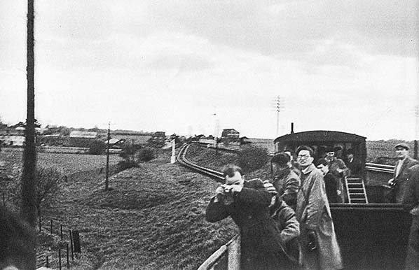 Photo by NC Simmons ![]() Presumably this view depicts the Railway Enthusiasts Club railtour of 6 April 1957 as it is the only known tour to have used use open wagons during the British Railways period. Class J15 No. 65443 is lifting the train up a 1:63 gradient, after which was a short level section followed by a falling 1:50 gradient before regaining the level at Feering. The summit of the line was shortly before Heath Siding (in the Down direction, shortly after in the Up). Plain to see is how after closure to passengers the line became a plain track connection from the Up main line. Left of centre can be seen Kelvedon Up Home signal, it's apparently 'tree trunk' like post is probably a photographic flaw. The low embankment left of centre and ending abruptly was the site of the Low Level station's carriage siding. We are also given a lesson in the fashions of the time; black, dark grey and fawn raincoats being standard along with various styles of hat and cap, although male headgear was no longer compulsory except on Sundays and formal occasions. Kelvedon main line station is just about discernible to the left of the prominent agricultural storage building background, right of centre.