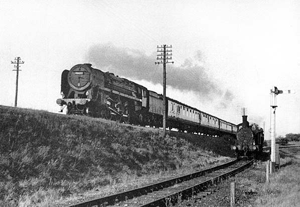 Photo by Dr IC Allan ![]() The ancient and the [then] modern side by side at Kelvedon, probably in August 1958. On the main line Riddles Britannia Pacific No. 70037 'Hereward the Wake' passes with an Up express passenger train while on the branch an unidentified Class J15 waits at the signal for clearance to continue up the incline onto the main line. Introduced in 1951, the Britannia Class was one of the BR Standard designs and the introduction into service was not without problems but with these remedied the class soon settled down. All the East Anglian examples had been transferred to other areas by 1963, ousted mainly and initially by English Electric Type 4 diesels. The leading carriage carries a destination board below the cantrail and the fourth carriage appears to be an ex LNER Gresley type. This is the only photograph that has come to light showing the upper quadrant Up Home signal installed sometime after the withdrawal of branch passenger trains, it having replaced the original, wooden, lower quadrant ex GER signal. While the Kelvedon & Tollesbury was not exactly awash with signals, this was the only upper quadrant metal type to have been installed on the branch. By the time of this photograph all track in the Low Level station had long since been removed, leaving the running line with a plain track connection up the incline to the main line.
