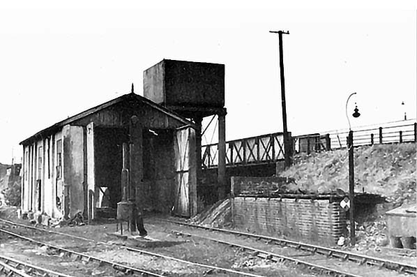 Photo from Jim Lake collection ![]() Kelvedon Low Level engine shed. This photograph is undated although evidence suggests it was taken immediately after closure. The coaling stage is for all intents and purposes devoid of coal and the gas lamp on the right has been partially dismantled. On Monday 7 May 1951 men arrived to remove furniture from the station yet some buckets are still present, bottom left, and the 'Fire Devil' brazier still stands beside the water column. The plate on the end of the coaling stage is a Limited Clearance sign with a red and white chequered pattern. This is an early example and in 1952 British Railways introduced a version with "Warning" in one white square and 'Limited Clearance' in the other and originally with block capitals. The text version is mounted with the 'Warning' white square at upper left and therefore with two sides perpendicular to the ground. This sign is still in use today. The engine shed was a small, single road affair capable of fully accommodating nothing larger than an 0-6-0T locomotive. No photographs of its interior have come to light and the brick building which stood behind it is only seen from a distance in a couple of photographs. The impression given by this photograph is of the brick building already having been demolished. To the right of the water tower is the footbridge from the main line station. This and the station footbridge had been de-roofed by the LNER.