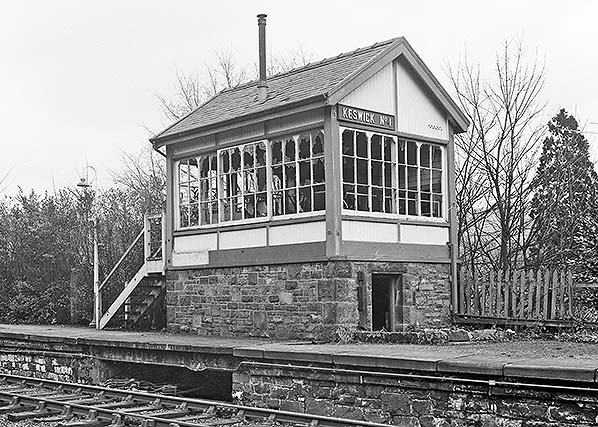 Photo from John Mann collection ![]() Keswick No.1 signal box at the east end of the down platform is seen c1970. The box closed on 4 December 1967 when the line was singled and all the windows are now broken.