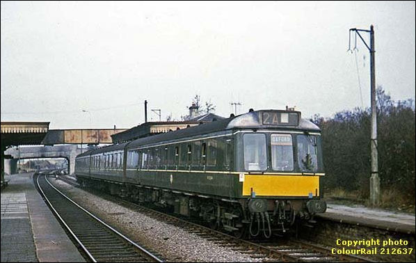 ![]() Another view taken in September 1965, this time looking north. The Banbury Road bridge had been rebuilt in 1925, prior to which it was a brick arch structure similar to the bridge in the background. Concrete was well established by 1925 but even so this bridge looked very modern for its time. Photographs showing Kidlington signal box are rare. It can see seen here through the bridge arch. Beneath the bridge can be seen the points leading onto the former Woodstock branch. The railheads are polished as this end of the branch was still in use at this time as a Down loop. In 1968 this, the Up refuge siding and the signal box would be abolished, the latter being demolished in 1970. Closer to home, as it were, there is evidence of demolition work ongoing. The Down platform, upon which the photographer stood, had been extended up to the bridge when the Woodstock branch was built. This extension has now gone and the track into the bay platform lifted. On the left a PW trolley loaded with recovered materials sits on the siding leading into the goods yard. The track through the goods yard, which extended over the forecourt to form the private siding to the bacon factory, which had closed by this date, may also have been lifted although the private siding agreement was not terminated until the following year. The footbridge, the steps of which are seen here, would soon be dismantled and taken to Didcot North Junction.