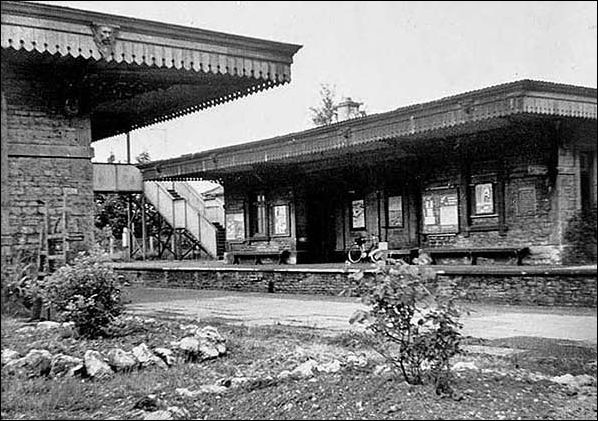 ![]() Photo from John Mann collection ![]() Looking south from the Down platform of the closed station in September 1965. The suggestion is that at the end of the final day the station was simply locked up and the staff walked away. Some signage and posters remain while the Gentlemen sign with pointing hand beneath the canopy harked back to an age long gone. Crude fencing has been erected in front of the main building, although there is no obvious sign of any wire, so presumably the building had already been let. Directly ahead of the camera the bracket signal still has the arm for trains branching off onto the Woodstock branch or rather the 40 chain stub which remained after the branch closed and also to access the goods yard from the Down direction.