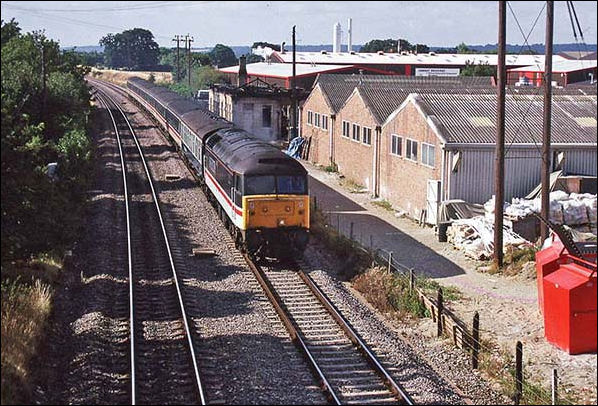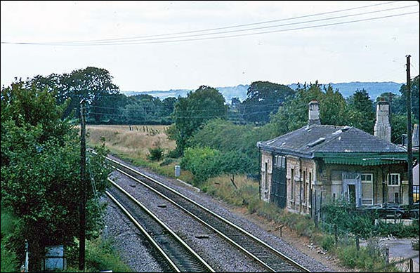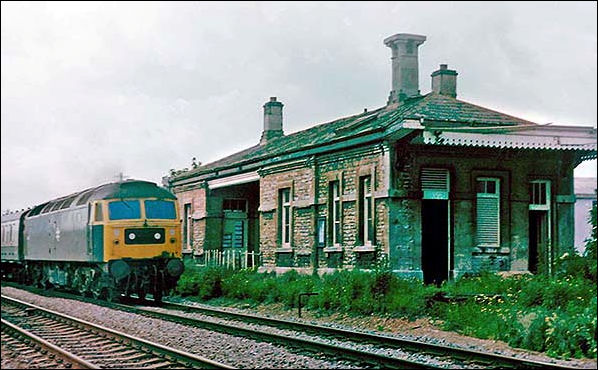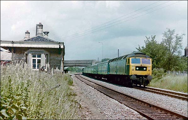 Another 'domino' fitted Class 47 passes Kidlington with a southbound train during the 1970s. The chimney visible far right is thought to have been on the former stationmaster's house. On the end of the station building the bay window of the waiting room can be seen, providing intending passengers with a good view of approaching northbound trains. This feature was common to most, if not all, of these 'Cotswold' style station buildings and the window was always placed so as to give a view of trains approaching, on double track lines, the platform upon which the building stood. However, these windows may have been flat originally as the style of bay window is typical of the early 20th century. Perhaps an architecturally knowledgeable reader can inform us.