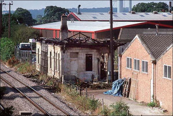 The fire damaged station building on 8 August 1990, the day after the fire. We cannot of course see inside the building but the damage appears to be confined to the roof and the fire had not spread to the adjacent buildings which look to be completely untouched but were subsequently demolished. Some cast iron canopy brackets were recovered and taken to Didcot and used for the rebuilding of Heyford station which is a very similar building from the same period. The building by this date was well hemmed-in between the railway and industrial estate, which latter has also obliterated the station forecourt. The building on the right sits more or less on the site of the Woodstock bay bufferstop and dock while where the lorry is parked on the left had been part of Stationmaster Cooke's gardens.