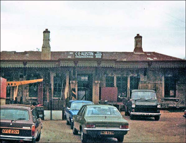 The station building across the forecourt in June 1981. By now the crude Kidlington Aerial Supply sign has gone and C. E. Austin Engineering have moved in. Note that the telephone number was still a Kidlington four-digit issue at this time. Kidlington telephone exchange still exists as of 2023 but the area now falls within the Oxford, 01865, dialling code. The building's roof was by this date starting to show signs of becoming decrepit although behind all the clutter the general fabric of the building appears sound. Among the vehicles are left, a much ridiculed Morris Marina estate and right, an anything but ridiculed Mk 1 Ford Transit pickup.