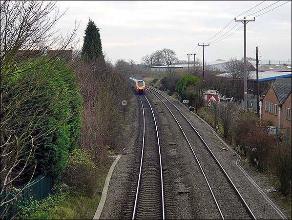 The site of Kidlington station looking south in February 2004. It would appear there is wrong line working in force, probably because of engineering work as the Class 220 DMU seems to be approaching the camera. The 'X 35' sign on the right indicates a 35MPH speed limit from trains running wrong line. Note the apparently new cable conduit alongside the Down line. The station building had stood where the gap in the hedging is on the right. Compare this view to that of 7 August 1990. Readily apparent is the wider than normal spacing between the two tracks, a legacy of the former broad gauge.