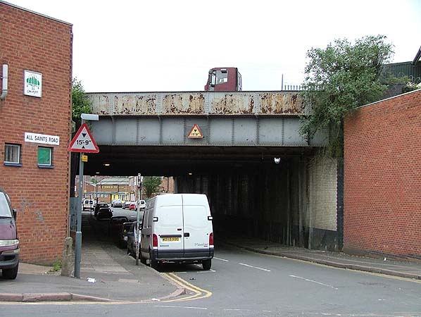 ![]() All Saints Road runs under the track bed and platforms. This bridge is still in place so that the northerly industrial units on the site of the platforms can be reached. Two short sections of platform remain above the bridge. Photo by Alvin Munton