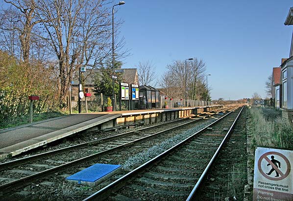 Lidlington station looking north-east from Station Road in February 2014. The current down platform is on the left with the former up platform on the right.