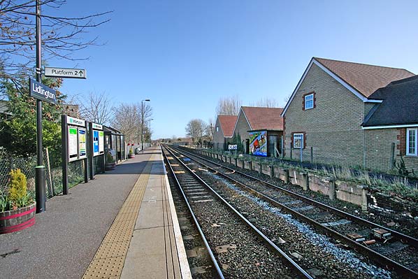 [Source: Nick Catford] ![]() Lidlington station looking north-east along the down platform in February 2014. The Friends of Lidlington station ensure that the platform is kept clean and well supplied with new flowers. They have also cleared undergrowth on the former up platform on the right as well as commissioning the mural seen on the former LMS toilet block. Photo by Nick Catford