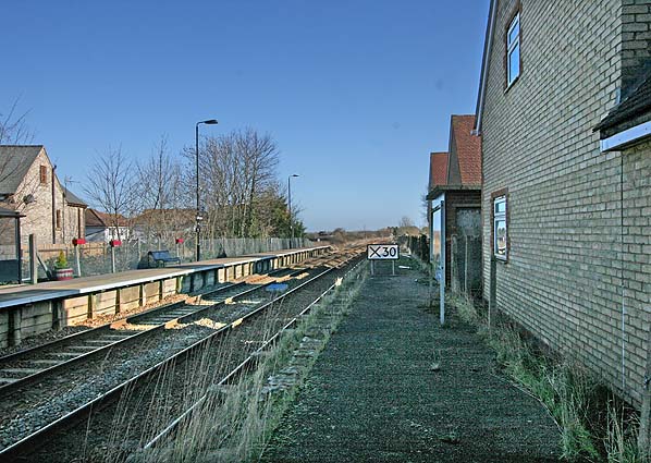 [Source: Nick Catford] ![]() Lidlington station looking north-east along the former up platform in February 2014. The platform edge stones have been removed to allow trains to pass at speed. The line is due to be electrified as part of a cross-country route from Yorkshire and the West Midlands to Southampton. Photo by Nick Catford