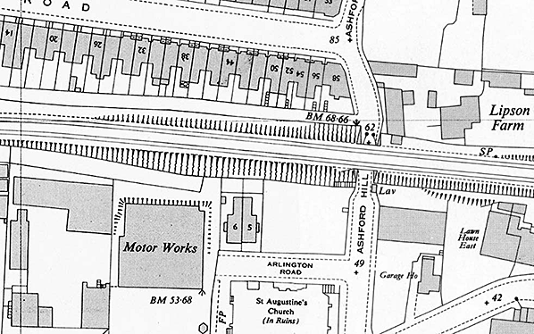 1:2,500 OS map from 1914 showing Lipson Vale Halt Access steps from Ashford Hill are seen at the east end of the down platform. Shelters are seen on both platforms. Shelters are seen on both platforms slightly offset from each other. Access to the up platform was from Holkham Lane running parallel to the line from Ashford Hill.