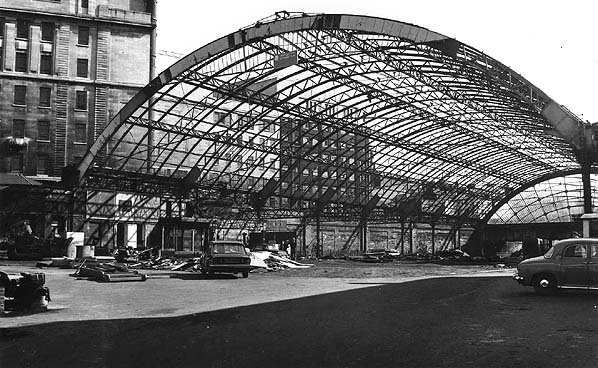 In the weeks leading up to final closure the lines into Liverpool Central station were cut back to the very end of the station's remaining platform. Only enough platform was left to accommodate a two car DMU. This allowed demolition work to commence even before the station closed. In this view looking south- east in March 1972 demolition is in progress. The roof has been stripped of its glazing and the stations main building has been demolished and cleared. At this time an hourly train service to Gateacre was still operating. The temporary platform was located at the furthest point from the photographer outside the trainshed.