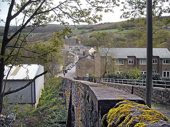 Looking north-east along the parapet of Blackwell Hall Lane bridge towards Station Road, Luddendenfoot, in April 2017. The site of station building was ahead between the modern industrial unit and the tall retaining wall. Photo by Alan Young