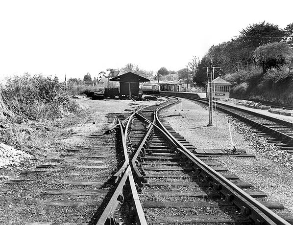 Looking north towards Lyme Regis station c. 1964. The engine shed closed on 4 November 1963 when the branch was converted to DMU operation. The track into the engine shed (behind the photographer) has been recently lifted. Photo by John Day