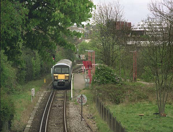 Merton Park Station looking north west from the shortened footbridge in April 1997